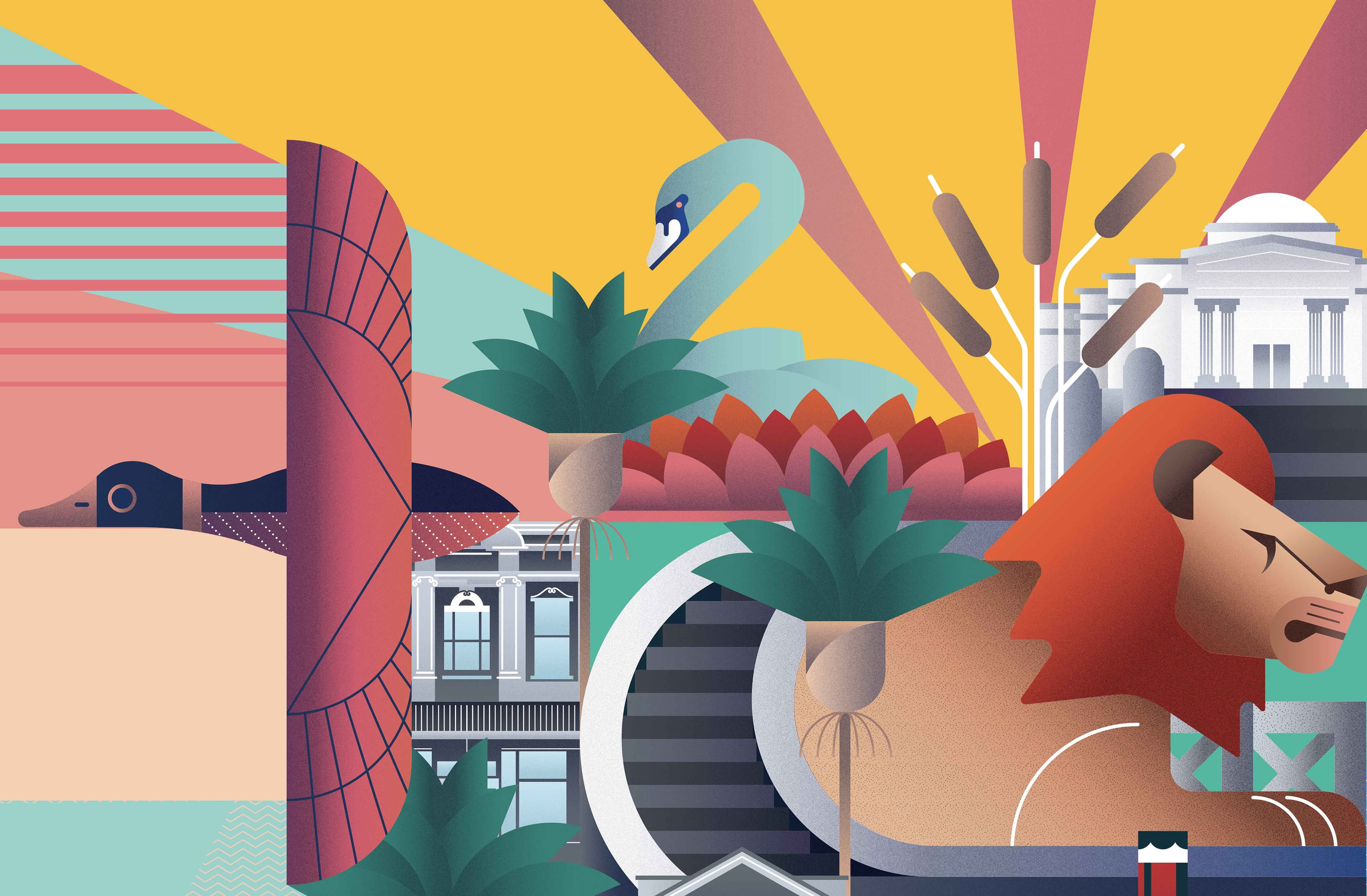 We designed colourful, memorable illustrations of local icons of the region so that people can easily spot the bus as it travels around and also discover places or things they identify with. We used a beautifully graphic, geometric style of illustration that uses a cohesive, bright colour palette. We used texture and pattern to add depth. We started with Mount Taranaki, then represented the coast with the ocean, celebrating ocean life with a crab, through to a squid travelling along through the seaweed under a fishing trawler before the healthy, active surfer beside the mouth of the Whanganui River and the eel (tuna) that wraps around the stylised, curving river. Above the squid we show the black sand beach and sand dunes of the region.