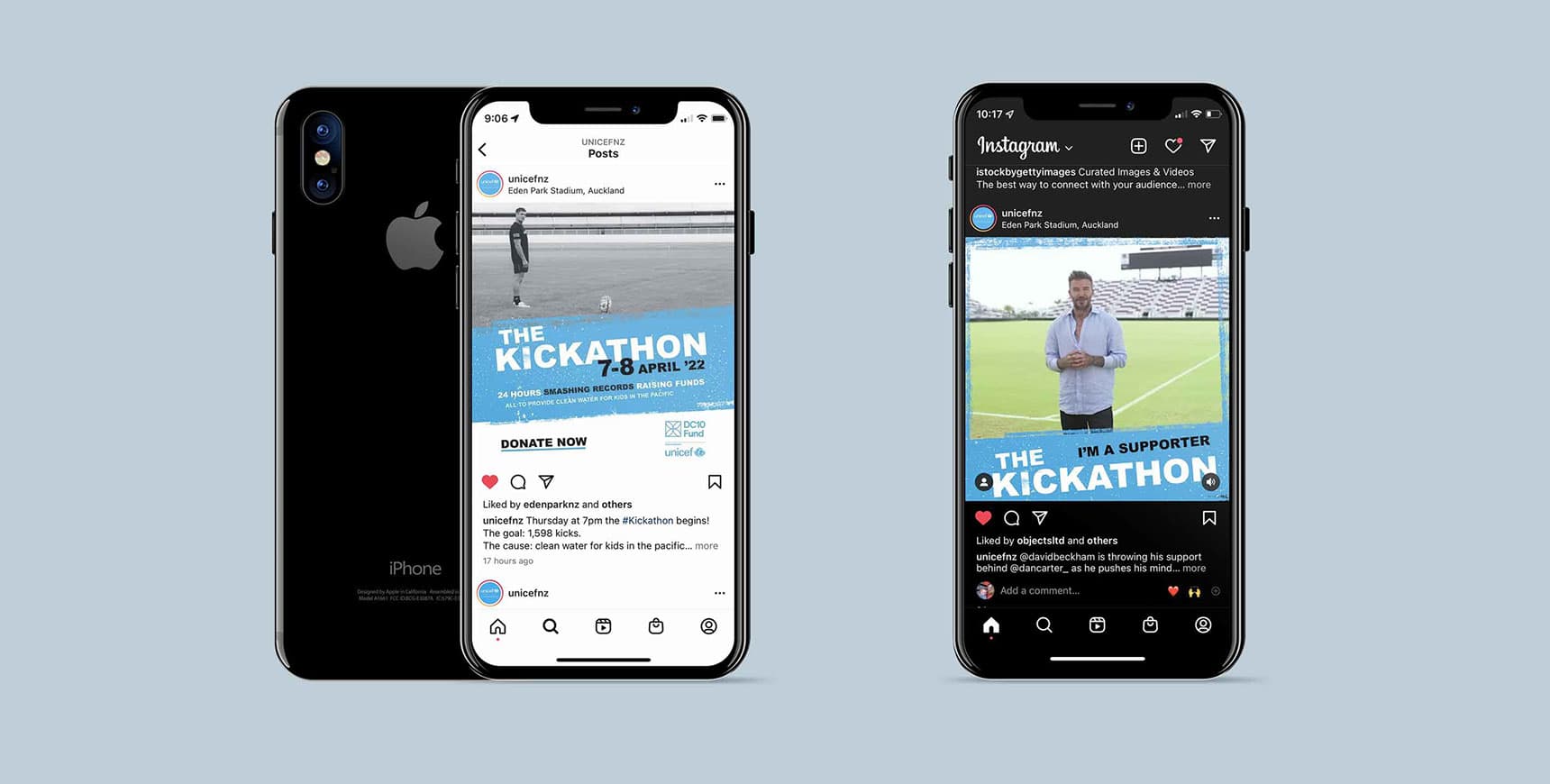 Rugby Legend and UNICEF Aotearoa ambassador Dan Carter pushed his mind and body to the limit with the ‘Kickathon’ to break world records by kicking goals for 24 hours straight at Eden Park to raise money for UNICEF’s work in the Pacific. UNICEF needed us to create a campaign that educates, excites and motivates a broad audience about the Kickathon and it’s charitable cause. The campaign featured strong contrast of black and white imagery with pops of brand cyan blue textural brush strokes. We have been developing the use more more human, imperfect, hand drawn elements to feel less corporate and more child like across various campaigns. This was partnered with strong, striking skewed type that was used consistently across the campaign. The campaign featured across multiple digital platforms as well as a digital frame for supporters to engage with and use the campaign. There were digital display billboards, posters and certificates of participation.